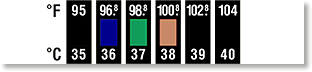 In addition to our standard forehead thermometers we also have our new ‘moving line’ thermometer (L320-100), which moves along the scale to show detailed temperature readings in both °C and °F with a moving yellow line, this technology is now used to monitor temperatures in hospital operating theatres. Place on the forehead in the usual way and read the temperature. The centre of the yellow line indicates the correct temperature.